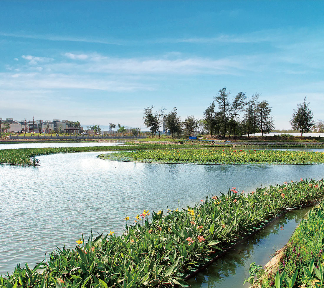 通过构建SYD全生态系统(微生态系统+沉水植物系统+挺水植物系统+水生动物系统)等技术体系,配合生态滞留净化区(生物基+人工湿地)+多功能净化漂浮湿地系统辅以驳岸改造